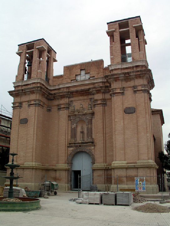 La fachada se encuentra enmarcada por torres en los ángulos que sobresalen del plano de la fachada. Las torres, comenzadas con un ambicioso plan compositivo quedaron inacabadas a la altura de la cornisa de la nave y solamente se añadió un cuerpo de campanass a la de la epístola, son cuadrangulares y están recorridas por pilastras toscanas de orden gigante. A las torres se les ha añadido recientemente el cuerpo superior. La torres enmarcan el atrio de acceso al templo, que se encuentra flanqueado por pilastras toscanas gigantes, sobre cuyos capiteles corre una cornisa. El acceso al interior se realiza a través de un gran arco de medio punto, sobre el que se sitúa una gran hornacina bajo el entablamento, y por encima un frontón construido recientemente. Culmina la fachada un tejaroz de ladrillo aplantillado.