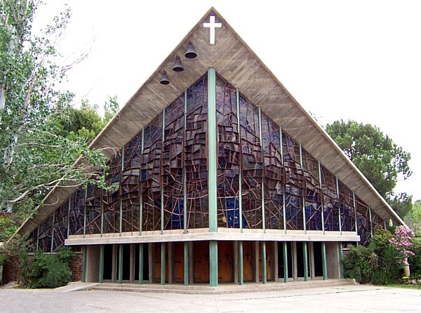 La capilla presenta una cubierta con forma de paraboloide hiperbólico apoyado en dos puntos y definido por dos piezas estructurales de hormigón armado, un arco parabólico y una gran viga en “V”. Los dos apoyos de la cubierta están rodeados por pequeños estanques de forma irregular donde se recoge el agua de lluvia. En el interior, el templo sigue las prescripciones del Concilio de Vaticano II y configura un lugar para la reunión de la asamblea eucarística focalizado hacia el altar y con una fuerte carga simbólica, a pesar de su sencillez y austeridad.