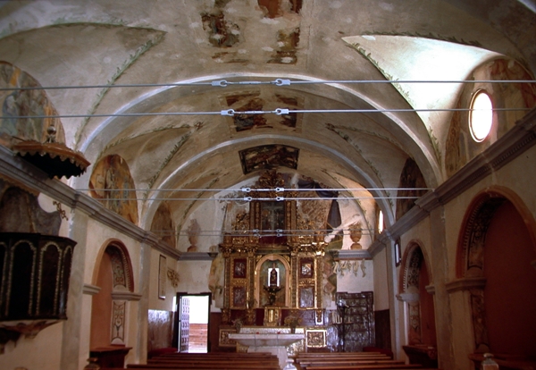 La planta es de una sola nave de cinco tramos cubiertos con bóveda de cañón rebajado con lunetos, reforzados por arcos perpiaños, del mismo perfil, que apoyan en pilastras. Entre estos se abren, en los tres tramos centrales, tres arcos hornacina de medio punto en cada flanco de la nave. El coro alto se sitúa a los pies sobre viga plana de madera. En el exterior destacan sobre el volumen rectangular, los contrafuertes en el lado derecho de la nave, mientras que en el lado del evangelio presenta el añadido de edificaciones auxiliares. Precede a la portada, que es adintelada, un pórtico abierto, al cual se accede por una prolongada escalera de dos tramos.