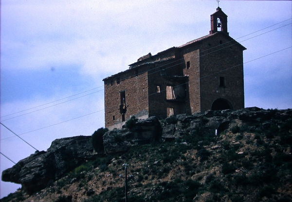 La fachada principal, muy esbelta, exhibe un arco de medio punto, una pequeña hornacina superior y se remata a dos aguas con una espadaña.