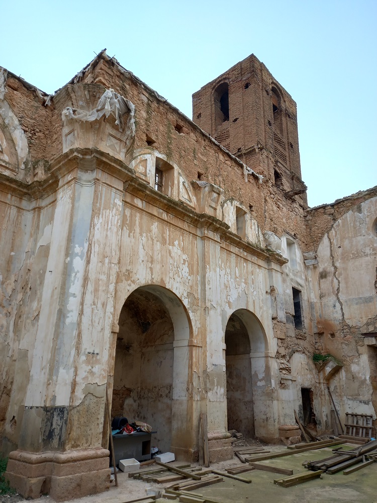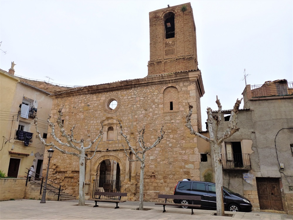 Sobre una de las esquinas de la fachada se levanta la torre campanario, de planta cuadrada, realizada en ladrillo cara vista dispuesto a tizón. Posiblemente sea una adición posterior a la construcción del templo. Originariamente tenía tres cuerpos. El inferior es ciego. Se separa del intermedio por una línea de imposta de ladrillo aplantillado. En el segundo cuerpo se abren cuatro ventanas de arco de medio punto, una a cada lado, donde se encontraban las campanas, bajo las cuales el muro se decora con dos paneles rectangulares de ladrillo, dispuesto en esquinilla. Había un tercer cuerpo de planta octogonal y chapitel lobulado, que fue retirado en 1978 por razones de seguridad.