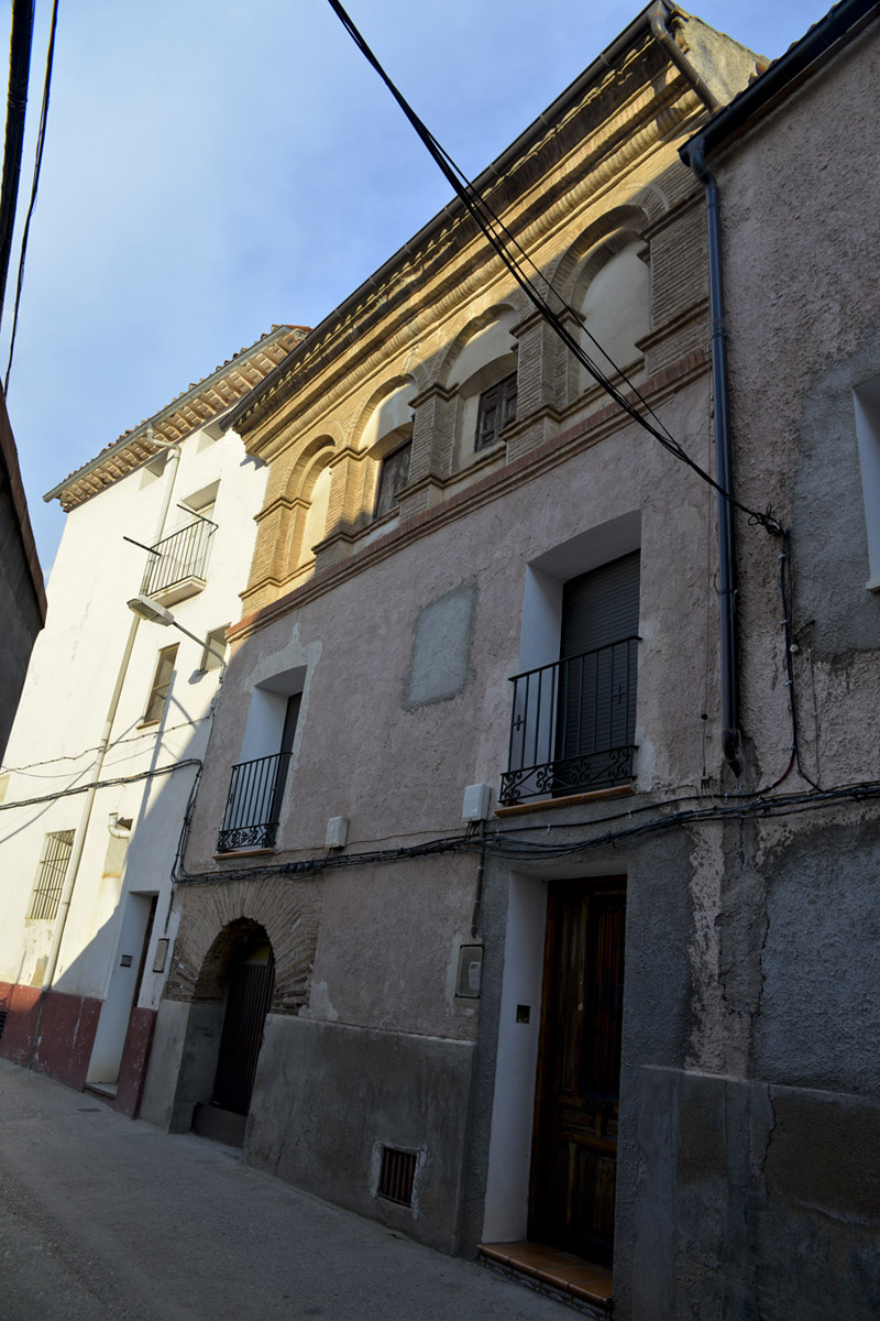 La fachada tiene tres alturas y conserva la portada de medio punto de ladrillo. Destaca la galería del nivel superior de cuatro vanos doblados, con arcos de medio punto y sendas impostas de doble listel, todo ello de ladrillo así como la cornisa de gran vuelo que presenta piezas aplantilladas en sucesivas formas de mdio bocel, cuadrado y gola, entre listeles.