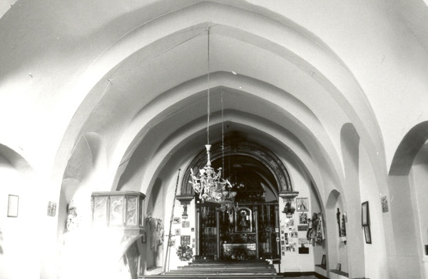 La iglesia consta de una sola nave de seis tramos con bóveda de cañón apuntado, reforzado por cinco arcos fajones, también apuntados.
