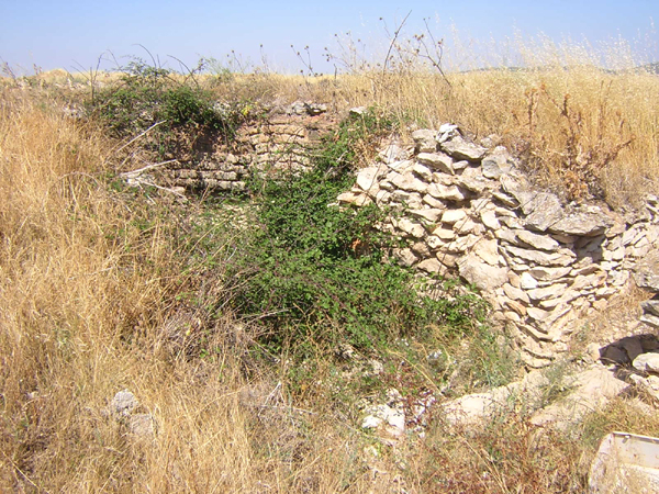Ladera con vegetación rala, entre campos de cultivos de cereal y cerca de restos de otras caleras.