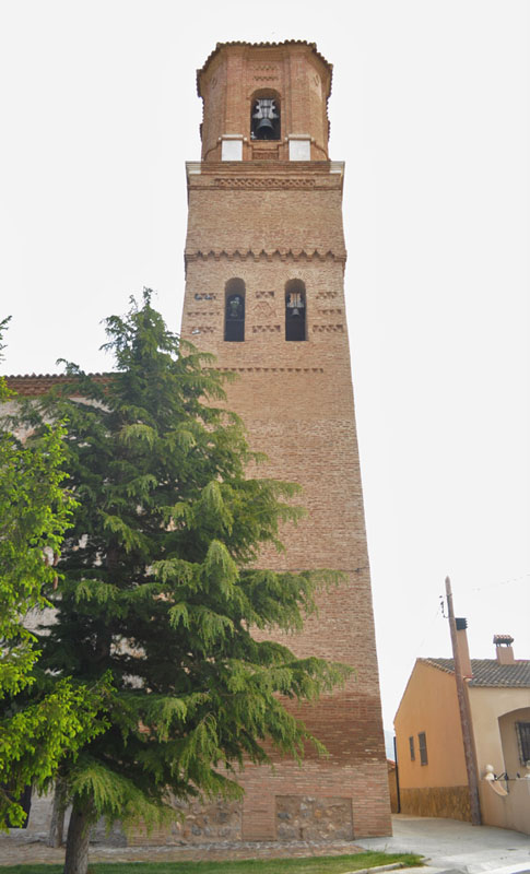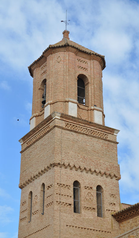 La torre mudéjar es el único vestigio que se conserva de la antigua iglesia. Con la reconstrucción de la iglesia en el siglo XVII se añadió el último cuerpo a la torre. La decoración de la torre es de origen islámico con estructura alminar. Está construida con ladrillo y se ubica a los pies de la iglesia. Es de planta cuadrangular y tiene tres partes: un primer cuerpo macizo y dos estancias superpuestas cubiertas con bóvedas de crucería de grandes nervios muy apuntados; éstos tienen sección cuadrada con las esquinas exteriores achaflanadas y cóncavas. La escasa decoración mudéjar se reduce al segundo cuerpo donde se abren las ventanas que albergan el campanario original. Aquí se localizan los elementos característicos del mudéjar aragonés como son las esquinillas. El último cuerpo realizado durante la construcción de la actual iglesia barroca es de planta ochavada y en ella se encuentra el actual campanario.