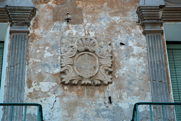 Entre las dos ventanas de la planta principal hay un escudo. Es de labra muy plana. Presenta un óvalo central liso, rodeado por motivos vegetales y esquemáticos, ofreciendo una impresión de conjunto más decorativa que propiamente heráldica.