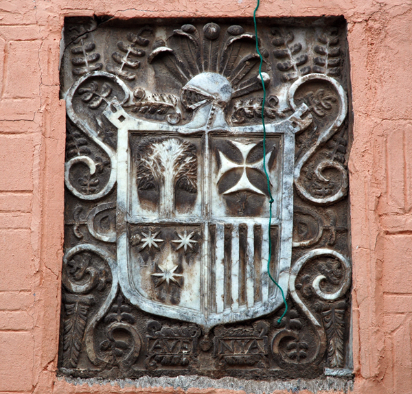 El modo de representar los elementos decorativos circundantes del escudo y su propia ejecución suponen una simplificación y esquematización de carácter popular de los escudos heráldicos del XVIII.