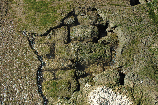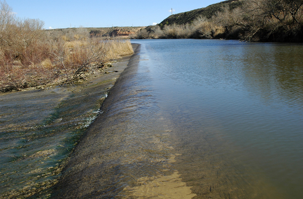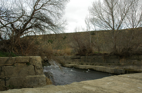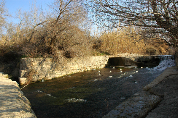 Por otro lado, igual que el resto de los azudes de la zona está construido en mampuesto, y en sección ofrece el mismo perfil: primero, aguas arriba, un talud con una inclinación de unos 45º, continuando en lomo en la parte superior que se prolonga en una pendiente suave de 8 a 10 m al otro lado.