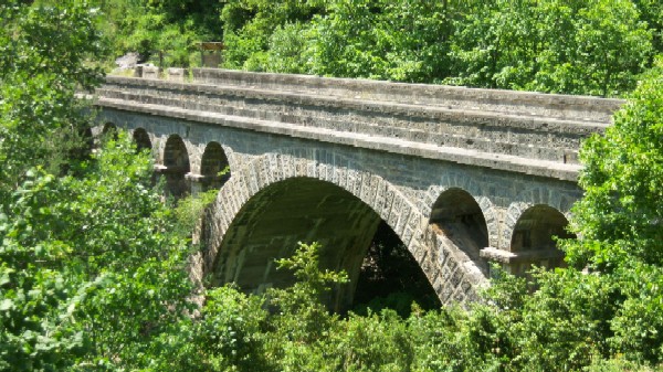 Su parte central está formada por un gran arco de medio punto dovelado bajo el que discurre el río Ara, acompañado por cinco pequeñas arcadas en su parte superior a un lado y dos al otro, abriéndose de este modo los paramentos del puente.
