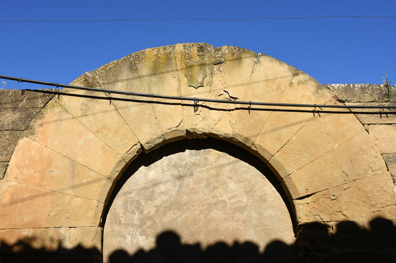 La fachada estaba orientada hacia el este. La parte conservada presenta únicamente el hueco de la puerta, situado en la parte central. Es un gran vano en arco de medio punto con dovelas que aumentan su grosor simétricamente a partir de una clave central más estrecha, cuyo frente presenta restos muy gastados de un escudete de pequeño tamaño que, según las descripciones más antiguas, tenía el frente liso.