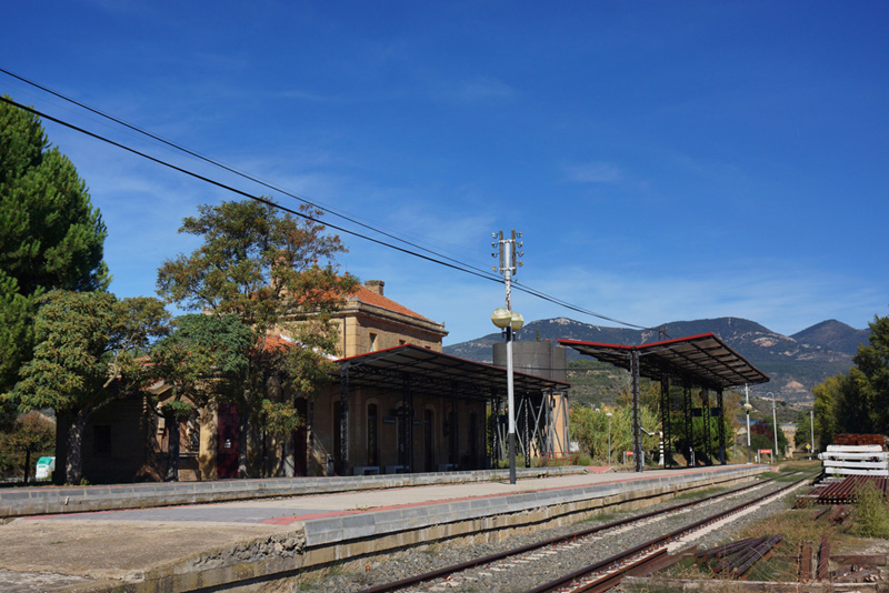 Conjunto formado por un edificio de viajeros, una pequeña cantina, un muelle de carga y unos depósitos, además de un andén central que separa las vías que la atraviesan.