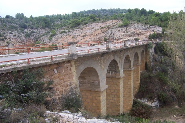 Puente de carretera de piedra realizado en cemento y recubierto de piedras regulares. El puente posee una arcada de cinco ojo con arcos de medio punto enlucidos soportados por unas pilas de gran altura que finalizan su recorrido en la ladera del desnivel otorgado por la orografía.