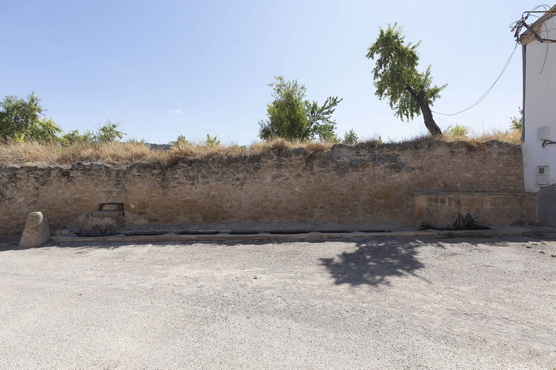 Las fuentes se encuentran apoyadas en un largo muro de mampostería que refuerza un talud. En el espacio existente entre ellas se dispone el abrevadero.