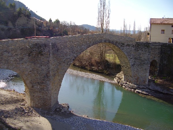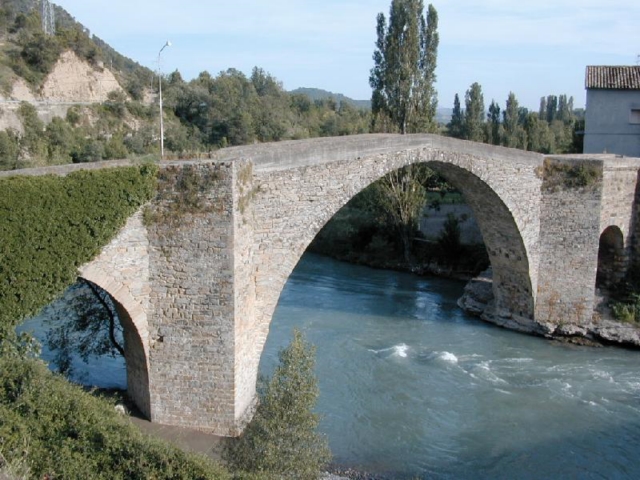 Construido en sillares alargados, bien trabajados, de tamaños iguales entre sí y dispuestos de forma ordenada en hiladas regulares. En la margen derecha el estribo se cimenta sobre afloración rocosa, lo que permite darle cierta longitud y necesariamente, para no ofrecer resistencia a caudales abundantes, abrir un aliviadero que arranca de la roca en esbeltas jambas y cierra en arco de medio punto. Tiene además dos ojos, siendo el central, de mayor luz (21 m), en arco de tres centros que parte, en la margen derecha, de la roca, muchas veces por encima del nivel del agua, y en la izquierda, de la pila sumergida en el lecho del río. El arco de la margen izquierda es un medio punto que arranca de tramo vertical en pila y estribo.