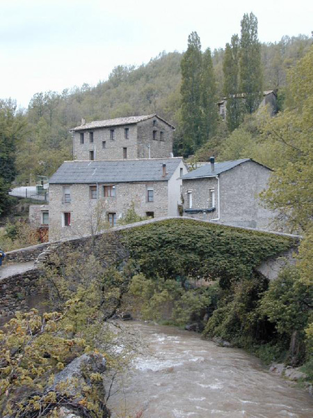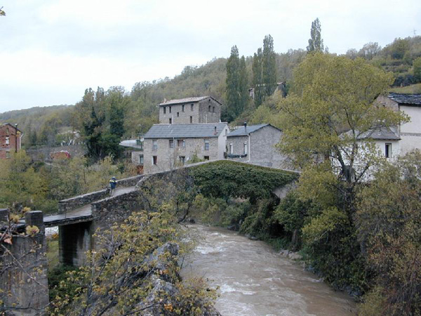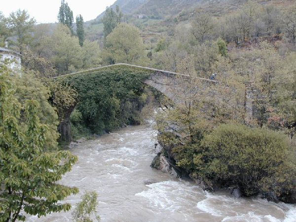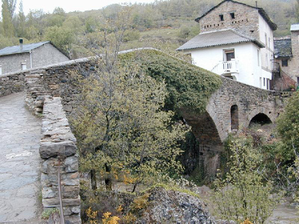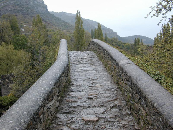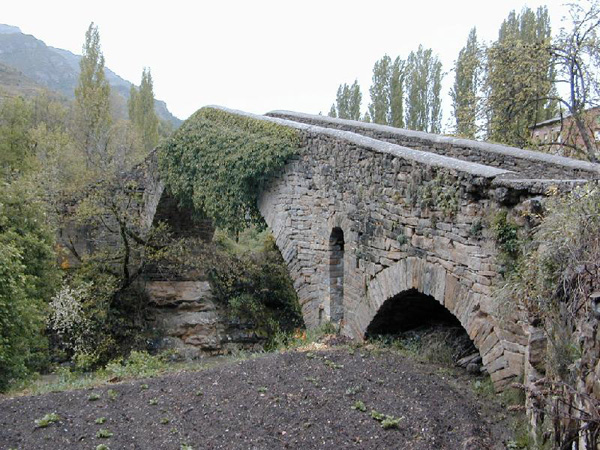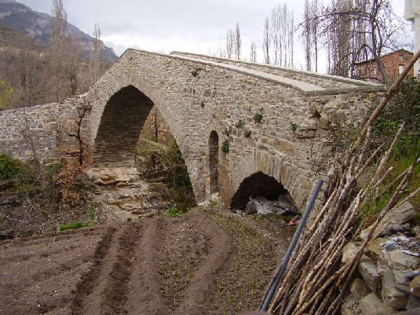 Puente construido en un tramo del Isábena de orillas y lecho rocosos. Actualmente solo se conserva un arco que apoya en un estribo de la margen derecha y sobre una pila levantada en afloración rocosa en medio del cauce. A partir de aquí el puente hacía un quiebro hacia el noreste con otro arco que fue arrastrado por las aguas, posiblemente en la riada del año 1964. Se conserva parte del estribo de la orilla izquierda. Para salvar el tramo desaparecido se utiliza una pasarela de madera. Se observa fruto de múltiples reparaciones, siendo de mampostería en la parte superior, en las proximidades del pretil. Es posible que donde haya sufrido menos modificaciones sea en el estribo derecho con piezas estrechas y alargadas, homogéneas entre sí, dispuestas en hiladas uniformes. Aparejo similar se observa en la pila central.