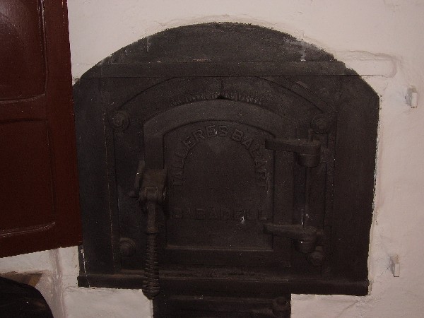 Encima de todos estos elementos se sitúa una campana rectangular de obra que semioculta un tragahumos que servía para avivar el fuego (con portezuela con la inscripción: TALLERES BALART /SABADELL), y que tiene en un lado una barra metálica para apoyar las palas.