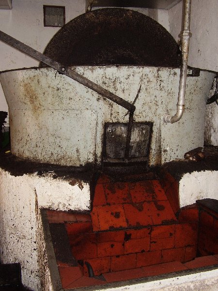 El molino es de tipo macerador, o italiano, que no sólo machaca las olivas sino que da la vuelta a la pasta molida. Consiste en un gran recipiente metálico con forma de doble tronco de cono invertido, que se corresponde con un depósito de agua en la mitad inferior y una tolva en la mitad superior, con una capacidad para 500 kilos. Esta tolva recibe las olivas que caen desde una cinta transportadora y son molidas en ella por una pareja grande de piedras circulares en disposición vertical que giran engarzadas a un eje central. La pasta resultante del machacado sale por una compuerta lateral y se desliza por una superficie en talud hasta una pileta cuadrada adosada a la base del molino, revestidas ambas de baldosa roja.