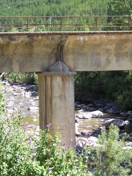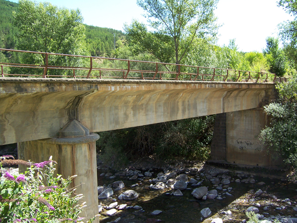 Puente de un solo tramo, de hormigón armado, compuesto por dos vigas de canto constante, apoyadas sobre pilas de hormigón de planta rectangular, con las esquinas redondeadas, las cuales asientan directamente sobre la losa de hormigón que apoya en el lecho del río. Se remata con barandillas metálicas a modo de quitamiedos.