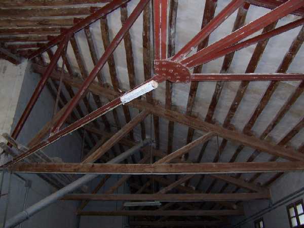 La techumbre utiliza como elementos de sujeción cerchas metálicas en combinación con estructura de vigas de madera, que soporta un falso techo de yeso. El edificio está precedido por una plataforma de cemento en cuyos extremos encontramos sendos tramos de escaleras.