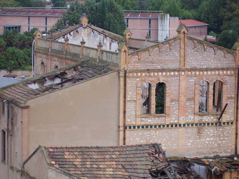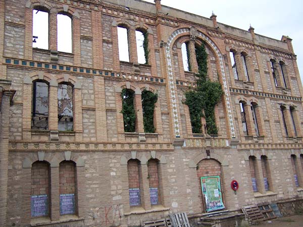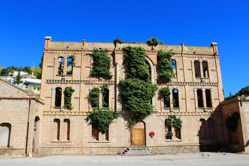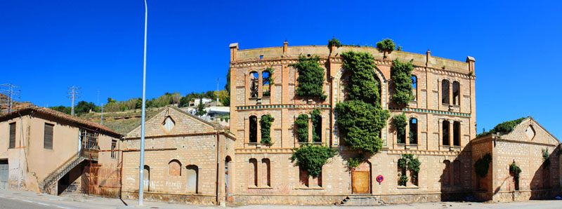 Respecto a su articulación, destaca por dos aspectos: su sentido de orden y simetría y su rico desarrollo ornamental. Todo arranca de un zócalo bajo de piedra del que arranca el primer piso de la fachada, con un total de cuatro pares de vanos gemelos, de desarrollo vertical, que flanquean, a su vez, a un vano central, donde se situaría el hipotético eje compositivo. Todos ellos aparecen actualmente cegados con ladrillo. Los anteriores vanos se rematan en arco rebajado, siendo el central de mayor luz que el resto. Asimismo, en cuanto a los materiales, las impostas y las claves de los arcos están realizados en cemento, al igual que sucede con los alféizares, que presentan, por otra parte, un ligero derrame ataludado. A continuación, observamos una banda horizontal de ladrillo que comprende motivos cuadrangulares que, a su vez, integra piezas de cerámica con motivos romboidales. El segundo piso acoge cinco pares de vanos gemelos que asumen las mismas dimensiones que los de la planta inferior, y se disponen abiertos al mismo nivel respecto a su alzado. En esta ocasión, sin embargo, hemos de observar la existencia de un quinto par de vanos localizado en el eje central de la fachada. Asimismo, estos vanos quedan integrados en una estructura más amplia que consiste en un amplio arco de medio punto formado por una moldura que ejerce de marco configurada por similares piezas de cerámica a las descritas antes. Este piso observa la particularidad en el aspecto decorativo de varias volutas de reminiscencias clásicas, colocadas en la base de cada pilar central (en caso del eje aparece especialmente decorado), sobre la superficie de una especie de plinto en relieve. Para el tercer piso, de nuevo, hemos de hablar de la moldura horizontal que debía de contener piezas cuadradas de cerámica, que da paso a la serie de ventanales, en mismo número que la planta inmediatamente inferior. Igualmente, hallamos el mismo tipo de uso de los elementos decorativos en relación con los materiales. Es a esta altura en que se cierra la citada estructura arqueada que configura el eje central según el cual se ordena la fachada, y es allí donde observamos que presenta un ligero resalte sobre la línea general de la fachada. Así, el arco con que se remata la estructura presenta a modo de clave un relieve de escudo realizado en yeso. Por último, hallamos una nueva moldura horizontal que integra motivos de ladrillo a modo de canecillos con piezas de cerámica con motivos estrellados. Finalmente, la fachada se cierra con un antepecho revestido de cemento dividido en cinco tramos a partir de la existencia de sendos pilares de ladrillo.