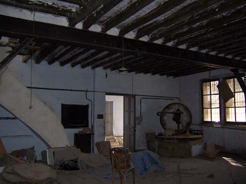 Edificio de planta rectangular que se cubre a doble vertiente mediante estructura de rollizos de madera. Presenta dos pisos en alzado, si bien se amplían a tres en un cuerpo lateral, que presenta una cubierta propia a doble vertiente, y que tendría funciones de vivienda. Respecto a las características del espacio interior, decir que las dependencias de la antigua fábrica se disponen tras cruzar un primer ámbito longitudinal, que presenta una techumbre de rollizos de madera, y cuyas superficies han sido enfoscadas y pintadas en azulete. Asimismo, el acceso a la nave tiene lugar por una puerta abierta en el paramento que encontramos nada más cruzar este primer tramo cubierto. Más adelante, tenemos un patio abierto, al que dan varias estancias interiores, principalmente de vivienda. El ámbito industrial es de amplias dimensiones, y presenta la escalera de acceso al resto de plantas adosada a una de las paredes perimetrales, en concreto, en la misma donde se abre la puerta de entrada. Este espacio presenta una estructura de rollizos de madera que se complementa con fuertes vigas de hierro, dispuestas éstas en sentido perpendicular, y que se sostienen, a su vez, sobre puntales en diagonal realizados en este mismo material. La maquinaria, varios molinos, se dispone junto a los paramentos, los cuales han sido enfoscados y encalados en su integridad. Por otro lado, el suelo es de cemento, y aún conserva en su superficie los raíles por donde discurrían las prensas. Estos elementos han desaparecido de este recinto en la actualidad. En un habitáculo aparte, encontramos los característicos algorines, adosados a uno de los paramentos, y revestidos en sus superficies por baldosa blanca. Respecto a las fachadas exteriores, en lo que concierne a la única que percibimos exenta, decir que ha sido levantada en ladrillo sobre un zócalo compuesto de tres hiladas de sillar de cantería. No obstante, la mayor parte de las superficies han sido enfoscadas. Por otro lado, este material resulta visible en los alféizares, jambas y dinteles de los vanos (en este último caso, comparte protagonismo con sendas placas de piedra colocadas en los extremos), así como, y sobre todo, en la parte de la fachada que integra la vivienda, de acuerdo a una finalidad eminentemente ornamental: en jambas, roscas de los arcos, alféizares y dinteles, o en el propio cierre de este tramo de la fachada, que se dispone según un perfil casi triangular, de manera que en sus tres vértices se levantan una especie de pináculos. En lo que respecta a su articulación, el piso bajo alberga una puerta de amplia luz rematada en arco rebajado; el intermedio ofrece un vano rematado en arco ultrasemicircular, que posee su propio balcón. Las molduras laterales en ladrillo muestran unas prolongaciones de perfil dentado. Lo mismo sucede en el piso superior, donde se abren dos vanos adintelados gemelos, en donde una moldura de ladrillo dispuesto a tizón hace de alféizar. En los respectivos dinteles, también se muestra la apariencia de este material, al que se suma la utilización de placas de piedra en los extremos y en el centro, coronando el pilar que los separa. En otro orden de cosas, el cuerpo principal de la fachada, presenta tres series de vanos gemelos adintelados, con los alféizares, jambas y dinteles realizados en ladrillo, más placas de piedra en los extremos y el centro de estos últimos. El paramento se cierra con una moldura de ladrillo dispuesto a tizón. Por último, decir que la cubierta emplea teja árabe.