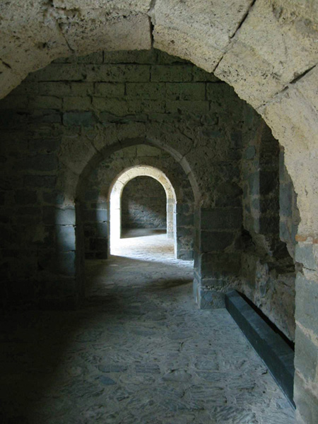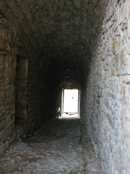 La entrada se ubicó en el lado este, precedida de la plaza de armas, la cual presenta muros con aspilleras. Desde ella se accede a la puerta principal a través de un puente fijo y partido que se une al levadizo. El gran tunel de entrada es un arco de medio punto seguido de bóveda de cañón. Tanto el túnel como el cuerpo de guardia anejo son de origen románico; parece ser que se aprovechó la nave de la antigua capilla de Nuestra Señora de Burnao sustituyendo el ábside por el elevador y el puente, así como el cuerpo de guardia debió ser la antigua sacristía en la que todavía se conserva la pila bautismal.