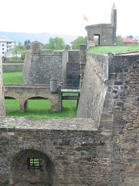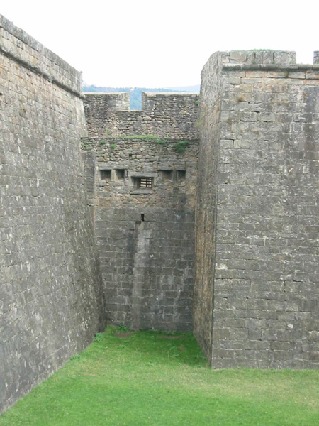 Precedida de una serie de obstáculos tales como el foso seco, el área de combate queda delimitada por la escarpa o muralla, de planta pentagonal, presenta potentes muros de sillería y mampostería, cuya parte superior está ocupada por un camino de ronda o circunvalación que rodea la muralla y une los cinco baluartes.
