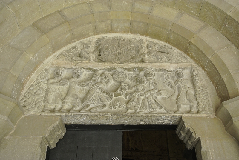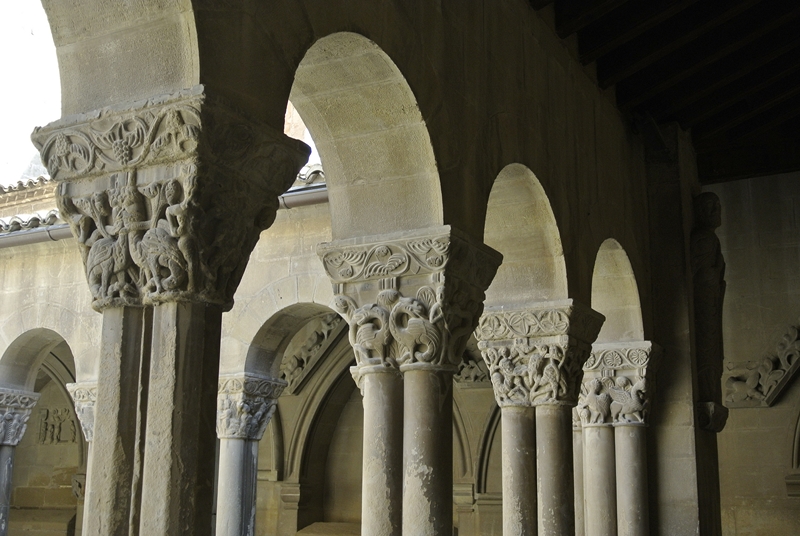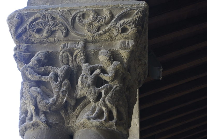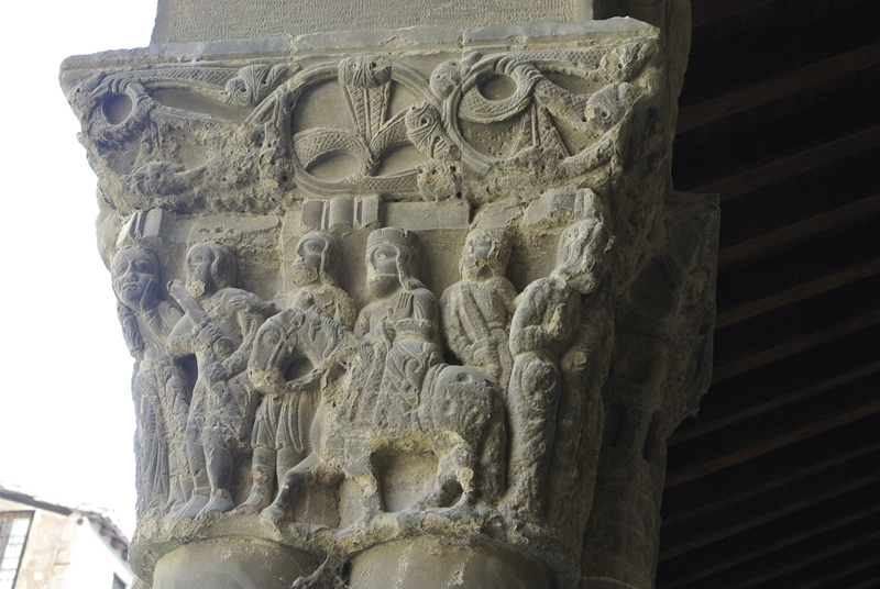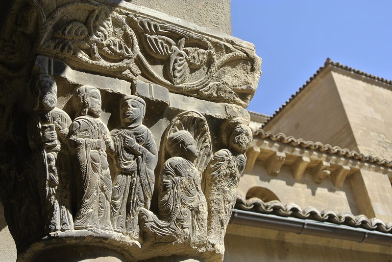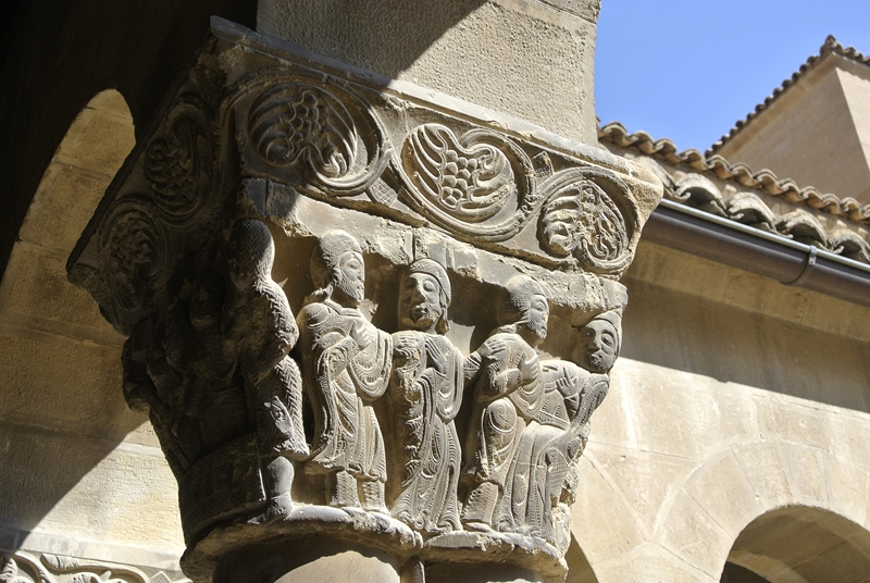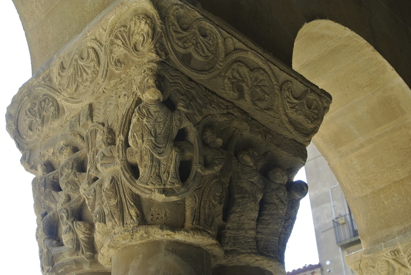 En cuanto a la decoración escultórica de los capiteles, el programa iconográfico original es imposible de conocer debido a la restauración del siglo XIX. En líneas generales puede decirse que, temáticamente, los capiteles pueden agruparse en dos grandes conjuntos: un ciclo evangélico, con escenas de las vidas de la Virgen y de Cristo, en la arquería norte y parte de la oeste; y una serie de escenas del Antiguo Testamento, en las arquerías oeste, sur y este.