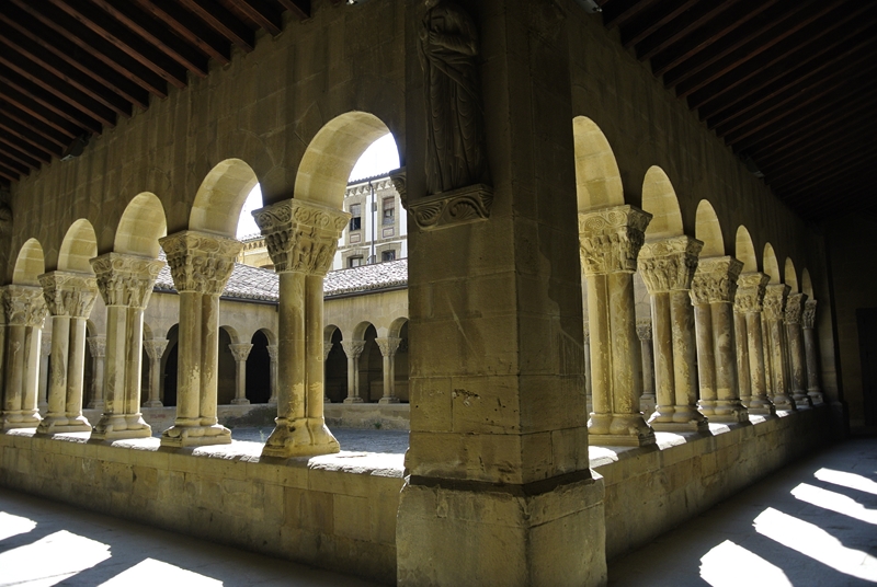 El claustro entero fue reconstruido por Ricardo Magdalena a principios de siglo, debido al estado ruinoso que presentaba. En esta intervención logró una recreación historicista del claustro románico, en la que algunos de los capiteles fueron sustituidos por copias realizadas por el escultor zaragozano García Ocaña, siguiendo fielmente los modelos originales.