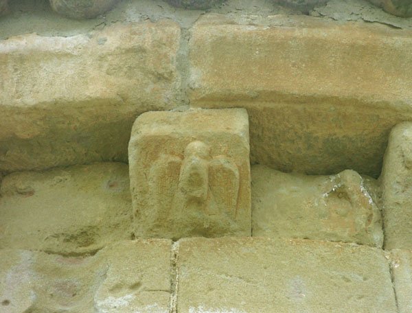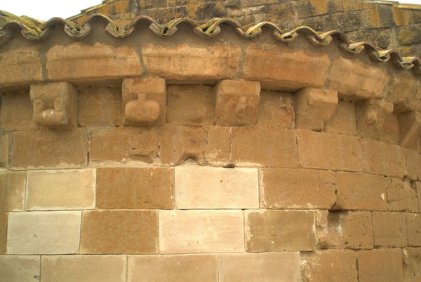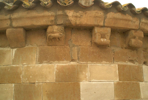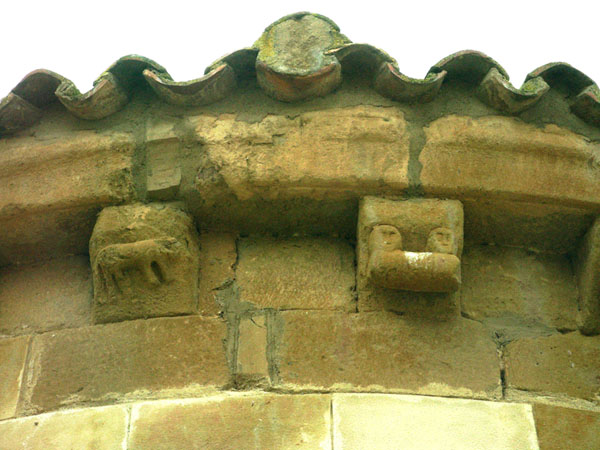 Al exterior aparece como una construcción exenta en la que se articulan dos volúmenes, el de la nave cubierto con tejado a doble vertiente y el ábside cerrado con tejado cónico; en ambos casos apoyan en los muros a través de una línea de modillones con decoración escultórica a partir de máscaras, toros y motivos diversos. Antes de su reconstrucción, el ábside presentaba un vano en doble derrame bajo un arquillo de medio punto.