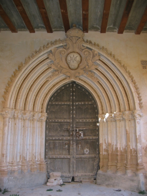 El acceso principal de la iglesia abre al claustro por el muro sur. A modo de portada ojival de cinco arquivoltas con escenas figurativas y motivos ornamentales vegetales. La capilla mayor abre al claustro mediante un gran arco de medio punto de sillería rematado con una cornisa sobre la cual se disponen restos de jarrones. El arco está cerrado mediante un gran portalón de madera.
