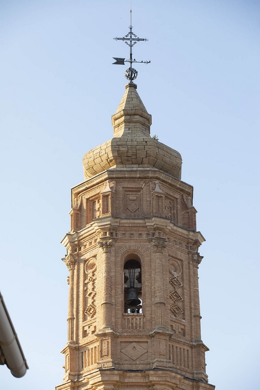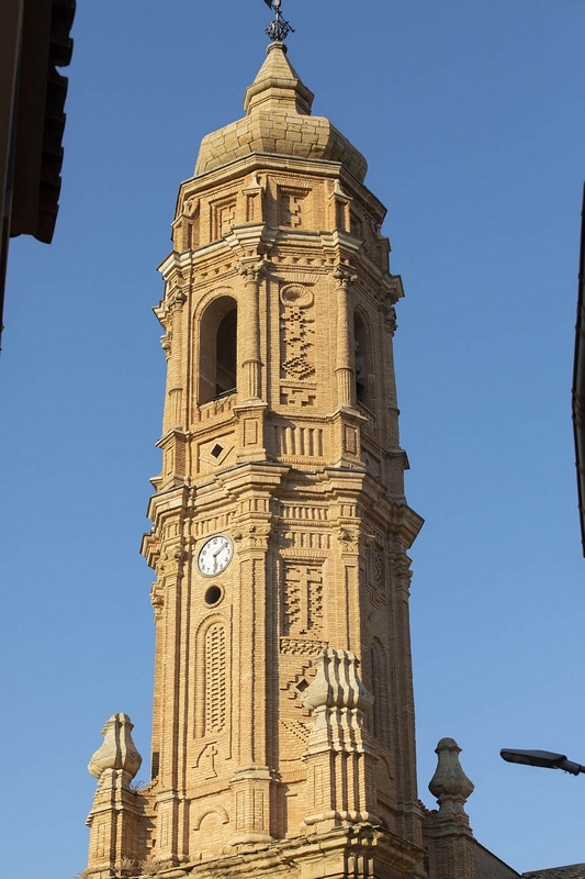 En su ángulo suroccidental se alza la esbelta torre construida por Valero Catalán entre 1743 y 1745. Consta de cuatro cuerpos separados por voluminosas impostas, el primero es de planta cuadrada y está realizado en sillar, mientras que los tres restantes tienen planta octogonal y están realizados en ladrillo. Está rematada por un chapitel bulboso y su decoración combina motivos clásicos con otros de tradición mudéjar.