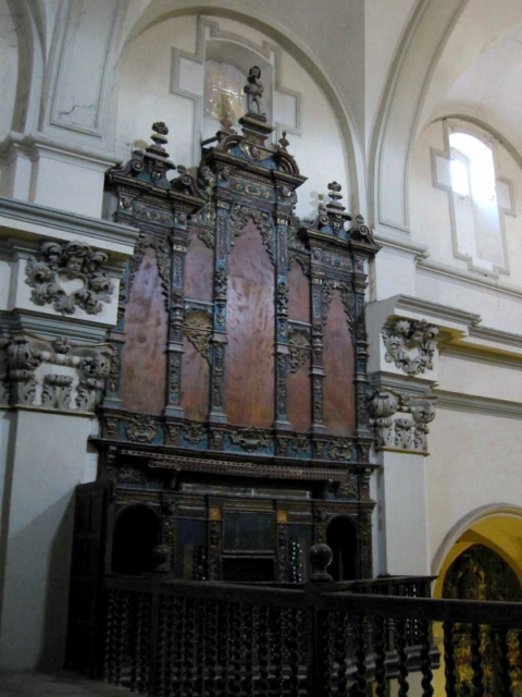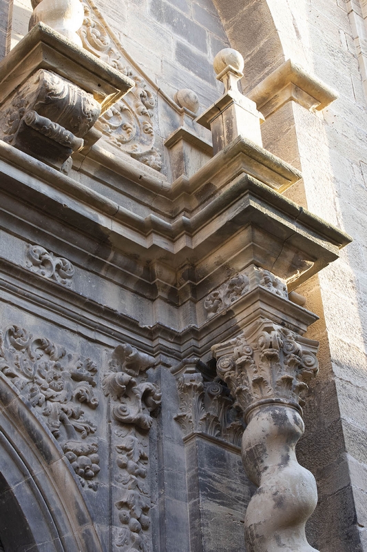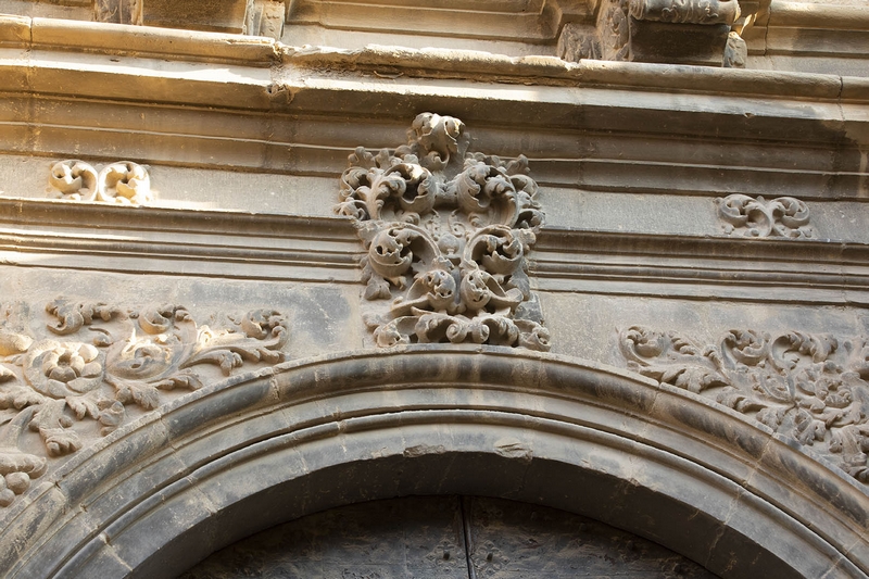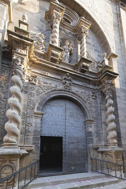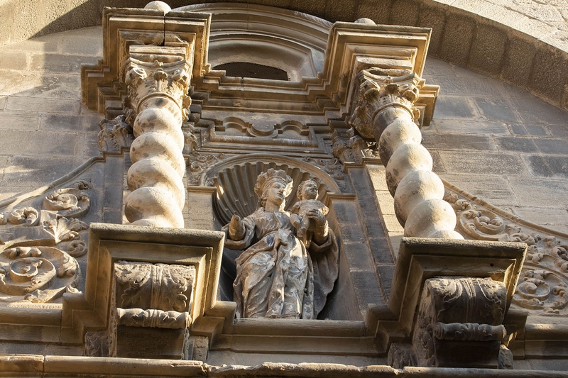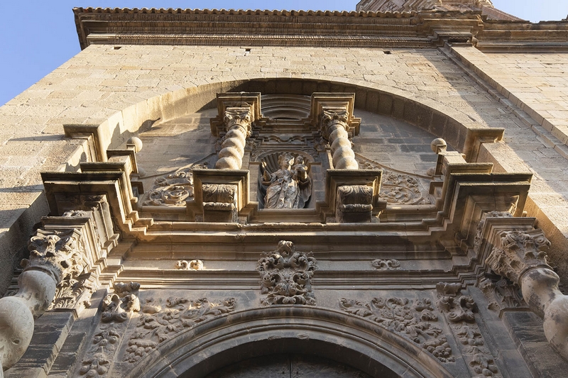 Destaca su portada principal a la calle del Estudio, abierta en arco de medio punto flanqueado por dos columnas salomónicas de orden gigante que sostienen un entablamento sobre el que hay una hornacina, también flanqueada por columnas salomónicas, que cobija una imagen de la Virgen con el Niño.