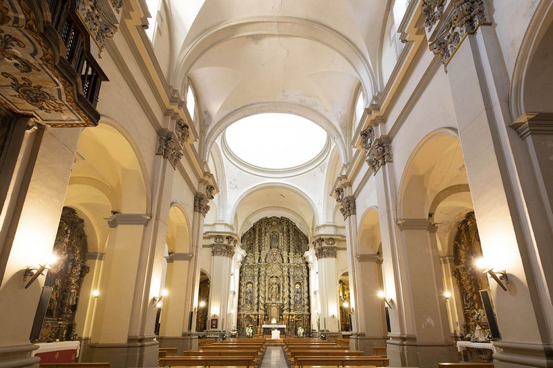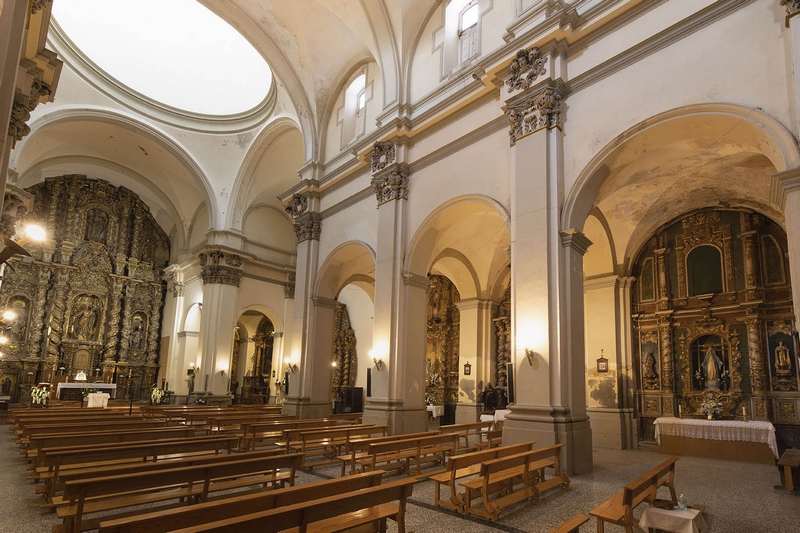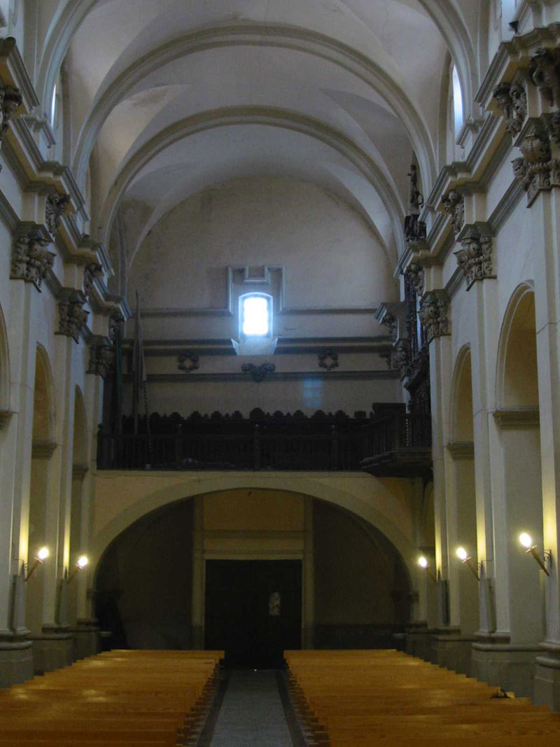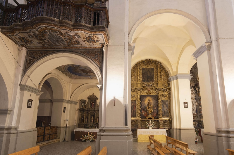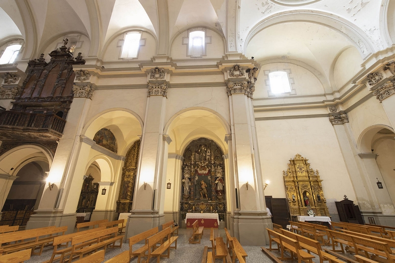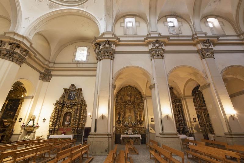 Consta de tres amplias naves, la central más ancha que las laterales, crucero no marcado en planta y cabecera recta. La cabecera y la nave central se cubren con bóvedas de cañón con lunetos, las laterales con arista y el crucero con cúpula. A los pies existe un coro alto, donde se conserva la caja de un bello órgano del siglo XVIII.
