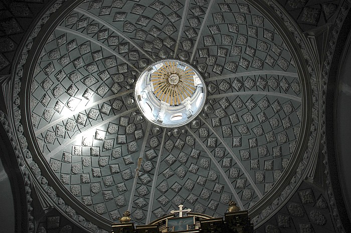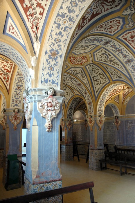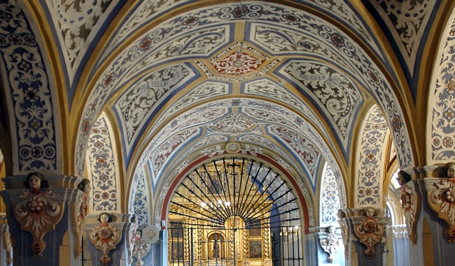 Todo el interior se encuentra recubierto por una decoración mural barroca a base de yeserías con motivos geométricos y vegetales pintadas en tonos vivos.