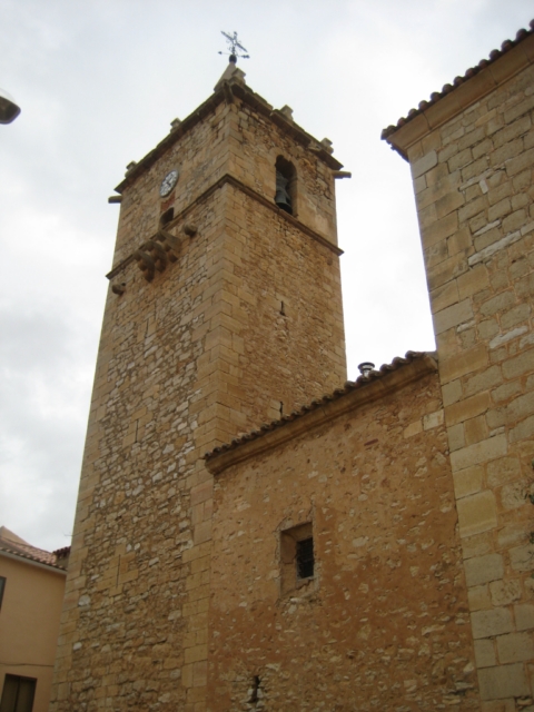 La torre se sitúa a los pies, con dos cuerpos de mampostería y hermosa veleta de hierro como remate. Esta torre medieval en un principio estaba aislada, hasta que en las reformas de 1864 quedó unida. El elemento de unión consta de dos tramos, cuya anchura abarca la nave central y la del evangelio, cubiertos por bóveda de medio cañón con lunetos.