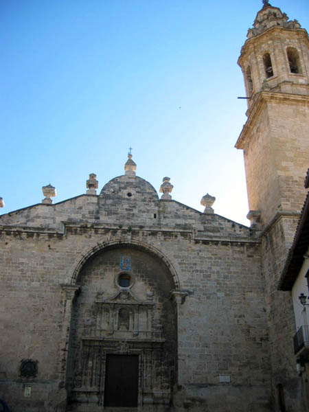 La fachada del templo es uno de los mejores ejemplos de la zona. Se abre en el hastial y posee perfil mixtilíneo y un gran arco de medio punto cobijando la portada. Ésta presenta dos cuerpos separados por entablamento, y rematada por un óculo. La puerta es adintelada. Ambos cuerpos están flanqueados por pilastras, y separados por un entablamento. En el cuerpo superior se abre una hornacina que en la actualidad está vacía.