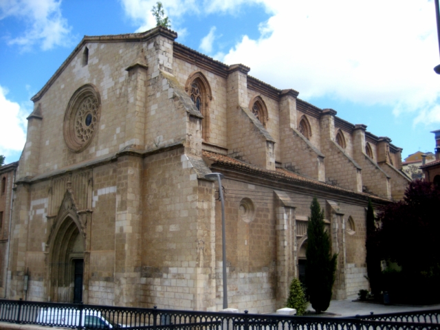 Exteriormente la construcción destaca por la pureza de líneas, utilizando buen aparejo de sillería en el que quedan destacados los contrafuertes por encima de las capillas laterales; en los tramos de la nave separados por los contrafuertes se abren esbeltos ventanales ojivales, que presentan labor de tracería con rosetas y tres huecos divididos por dos maineles.