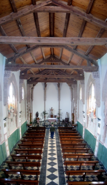La iglesia, de nave única sin capillas, culmina en una cabecera pentagonal que presenta los paños lisos y ciegos, separados por los mismos pilares de ladrillo que sirven de apoyo a los canes de la cubierta. A los pies se sitúa un coro elevado sobre superficie arquitrabada de vigas de madera, con antepecho del mismo material, al que se accede por una sencilla escalera de caracol también de madera.