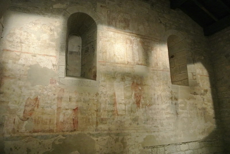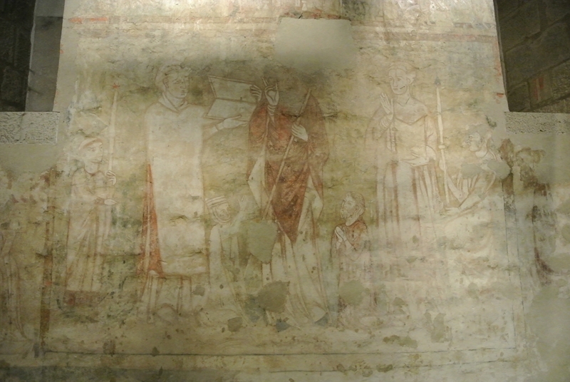 El programa iconográfico se desarrolla en cuatro registros, adaptados al muro liso de la cabecera roto por dos ventanas abocinadas en arco de medio punto, así el primer registro ha desaparecido casi por completo, en el segundo se narran pasajes de la vida de San Martín de Tours, de los que se distinguen las escenas de la Misa de San Martín o San Martín Obispo electo de Tours, acompañado por su séquito, y con los donantes arrodillados a sus pies. En el tercer registro y bajo arcos de medio punto se observan tres personajes de cuerpo entero y al fondo una ciudad, entre cuyas edificaciones destaca una torre por la que ascienden y descienden otros personajes. Del registro superior apenas han quedado algunos restos, aunque es muy probable que este espacio estuviese reservado para la representación del Pantócrator o Cristo en Majestad.