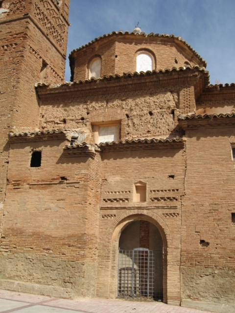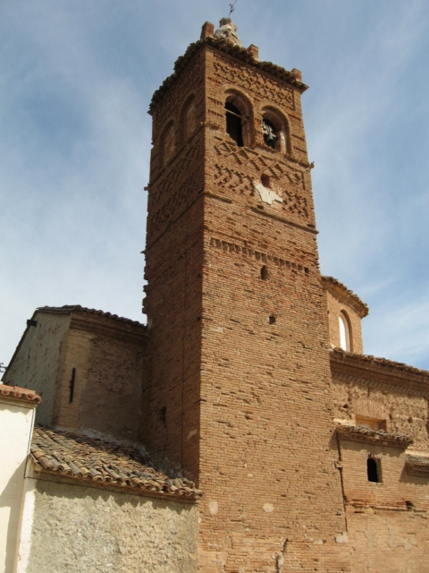 El exterior de la iglesia presenta un marcado carácter palacial-civil, especialmente por el torreón que se levanta en el extremo meridional de los pies, restaurado en la actualidad, y que consta de cuatro cuerpos separados por imposta, abierto el superior mediante galería de arquillos de medio punto doblados, y culminado por cornisa de hiladas de ladrillo en esquina; bajo la imposta que separa el último cuerpo destaca una banda de decoración cerámica bicolor.