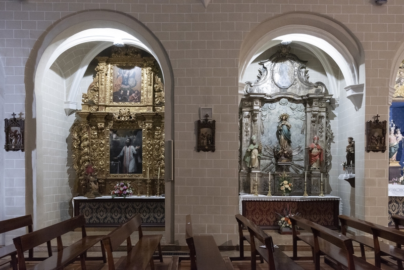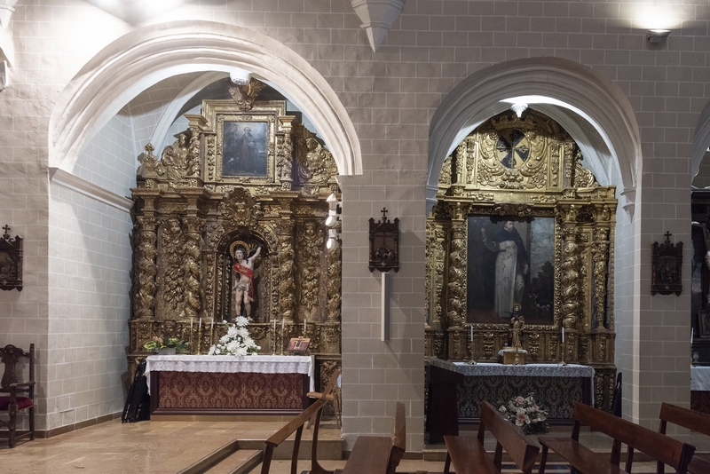 Se trata de una iglesia de nave única de dos tramos, con presbiterio de testero recto en planta; a ambos lados de la cabecera y de la nave entre los contrafuertes se adosaron capillas de planta cuadrada y rectangular, una a cada lado de la cabecera y cinco a cada lado de la nave.