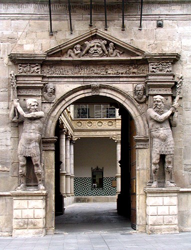 La portada, de proporciones monumentales e ideada por Guillaume de Brimbez, se encuentra articulada mediante la disposición del acceso bajo un arco de medio que apea sobre pilastras sencillas y flanqueado por dos gigantes esculpidos colocados sobre elevados pedestales; sobre los gigantes dos capiteles soportan el entablamento de características muy sobrias cuyo mas importante atractivo se centra en la disposición del friso corrido decorado en relieve. Remata la composición un pequeño frontón triangular. Iconográficamente la portada es la más pura representación plástica del poder político, social y cultural. Uno de los gigantes se identifica con Hércules y el otro con Teseo. El friso corrido representa un triunfo de Cesar, mientras en el tímpano se representa a Helios, el Sol, con su corona de rayos, flanqueado por la Aurora que levanta el manto de la noche de rostro, y el Ocaso que se dispone a cubrirse con él. Las cabezas de las enjutas son personajes de la Antigüedad relacionados de algún modo con la Virtud y la Razón. Sobre las pilastras dos amorcillos son atraídos por el vaso de la Virtud, mientras que al otro lado dos faunos se apartan de él.