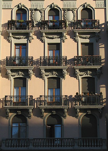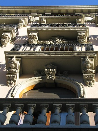 En la primera planta se desarrolla una balaustrada corrida que apoya sobre ménsulas talladas, abarcando toda la fachada y extendiéndose sobre el portón del garaje. La composición de las cuatro plantas principales es muy semejante: en la zona central abren tres balcones por planta, siendo en arco de medio punto los de la primera y la cuarta, en arco rebajado los de la segunda y adintelados los de la tercera, y todos ellos con rejería de hierro forjado. En los extremos de la fachada se disponen los miradores con huecos acristalados que presentan pequeñas variaciones de tratamiento. En la cuarta planta el mirador se abre en balcón de igual tratamiento que los de la zona central pero con balaustrada de cemento.