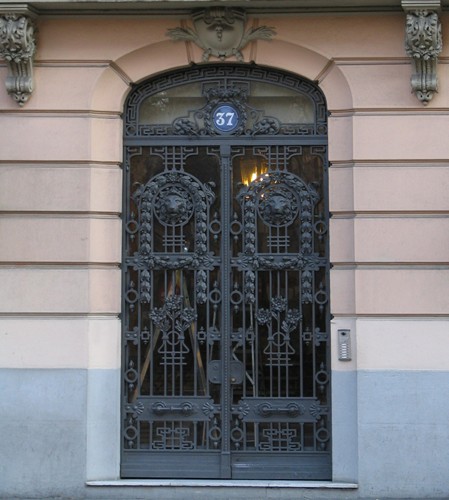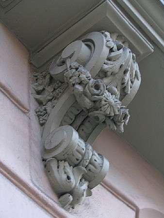 La composición se completa con decoración realizada con molde de cemento; bajo los voladizos de los balcones se disponen ménsulas decoradas y guirnaldas de motivos vegetales; en la planta cuarta dos medallones enmarcados por coronas de hojas flanquean el balcón central, rematándose los huecos de esta planta con relieves decorativos. La fachada se completa con cerrajería de hierro forjado en los balcones de las tres plantas superiores y en los miradores de las plantas segunda y tercera.