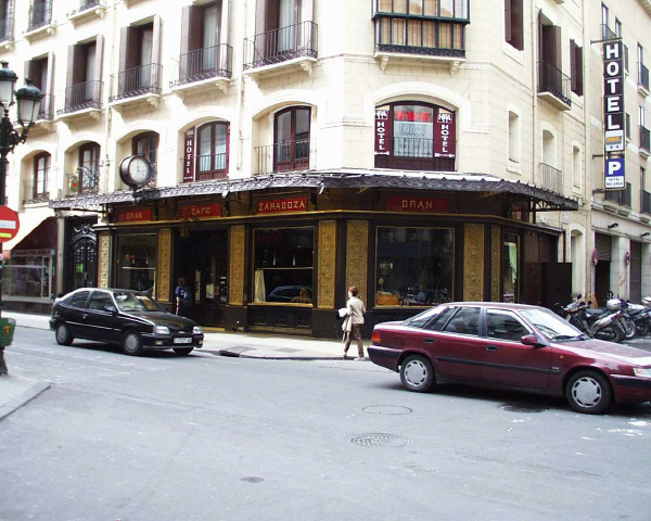 Exterior: Presenta una gran fachada en chaflán a la calle Alfonso I y a la calle Contamina, bajo el edificio de viviendas propiedad de Mariano Baselga.