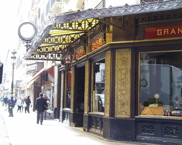Presenta una gran fachada en chaflán con cuatro expositores acristalados, enmarcados por plafones rectangulares decorados con paneles de plata repujada y sobredorada con motivos vegetales. La puerta también es acristalada y se encuentra rematada por un entablamento y un pequeño frontón curvo.