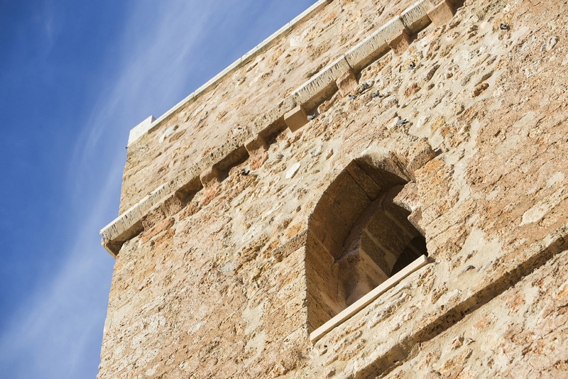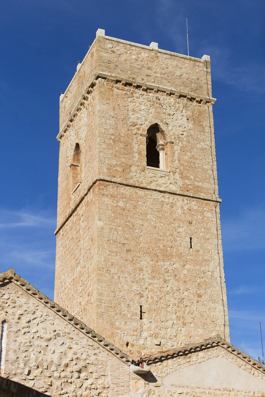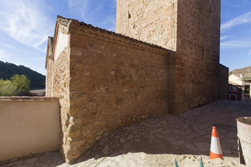 La torre está situada en la cabecera, en el lado del evangelio. Consta de un piso macizo y dos pisos realizados en mampostería y sillar, con aspilleras y husillo para las escaleras del interior, que ocupa casi la mitad de las estancias. Estas se cubren con bóveda de cañón sobre dos nervios cruceros rectangulares con esquinas achaflanadas. El piso superior, el campanario, tiene cuatro vanos apuntados con arco interno a modo de diafragma que apea sobre capiteles cúbicos. Este piso se cubre con bóveda esquifada sobre nervios diagonales muy apuntados; encima está la terraza.