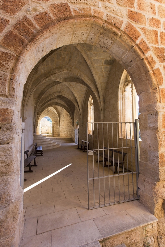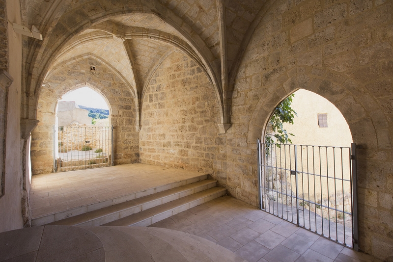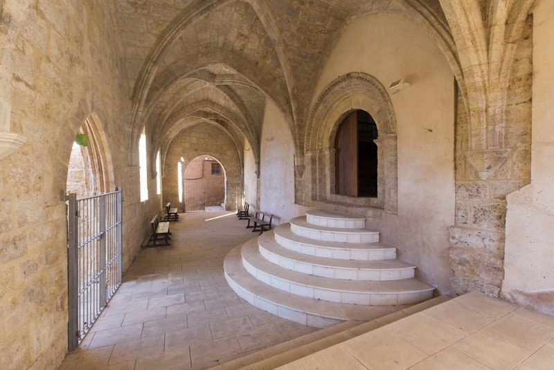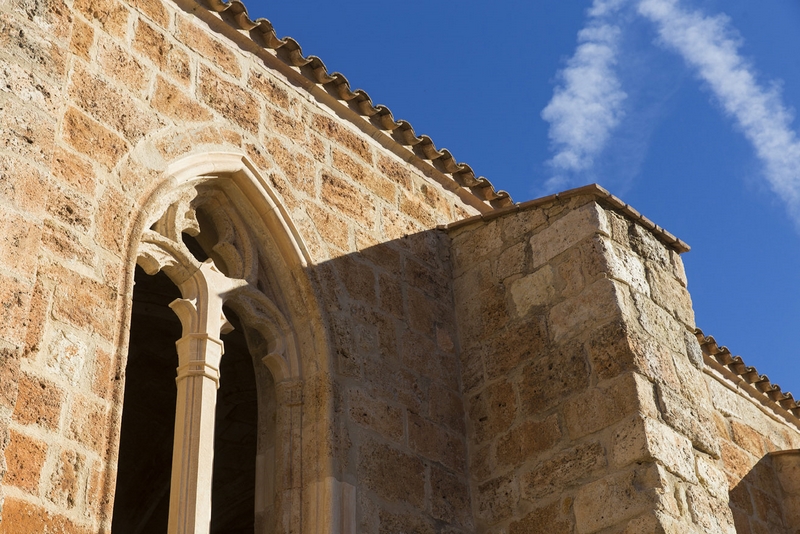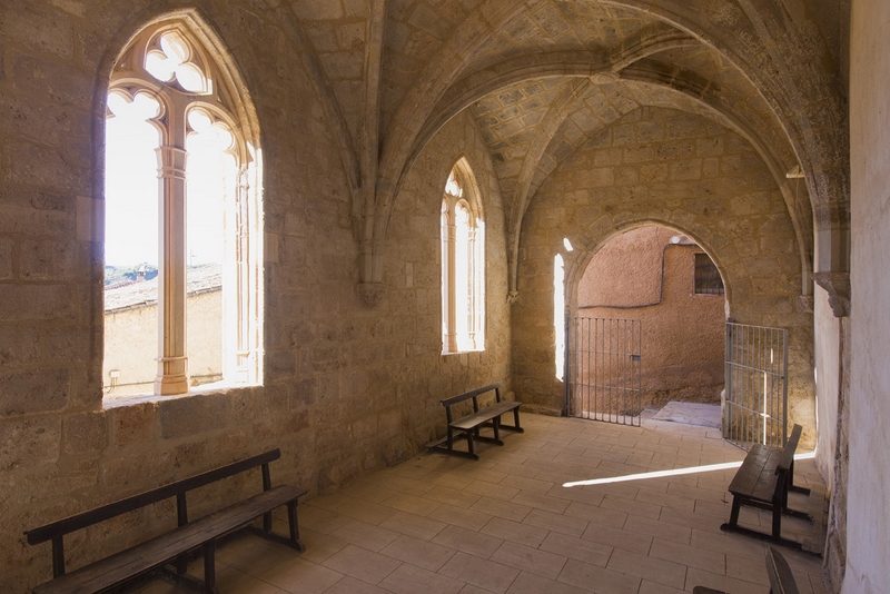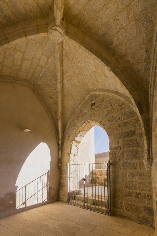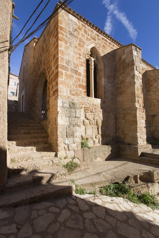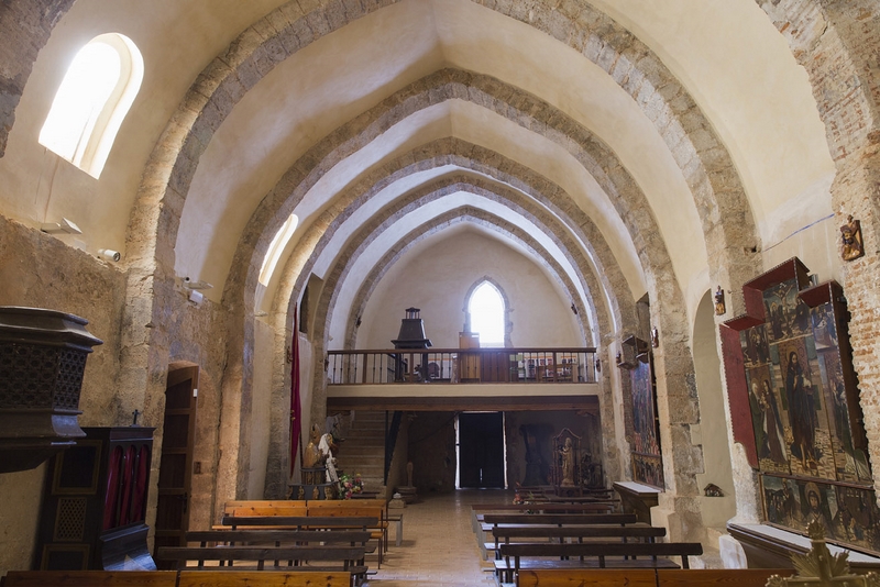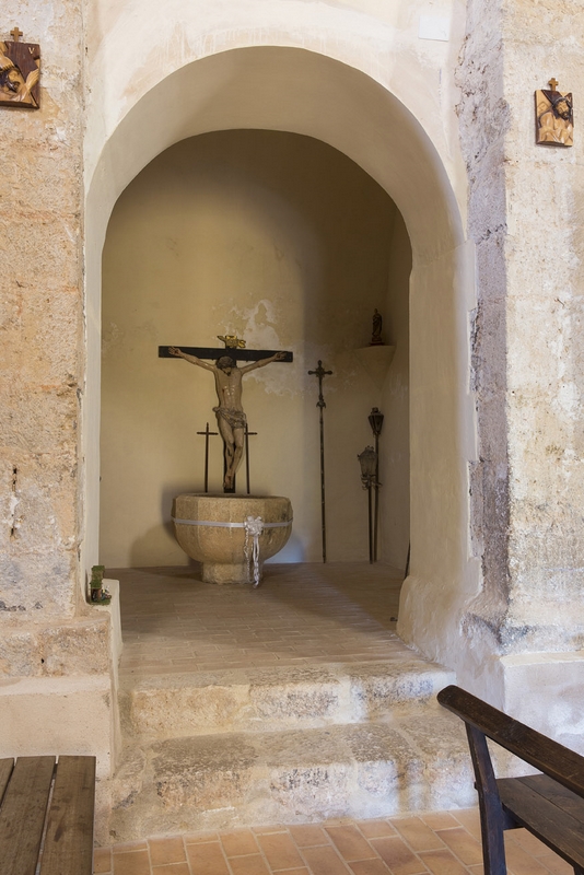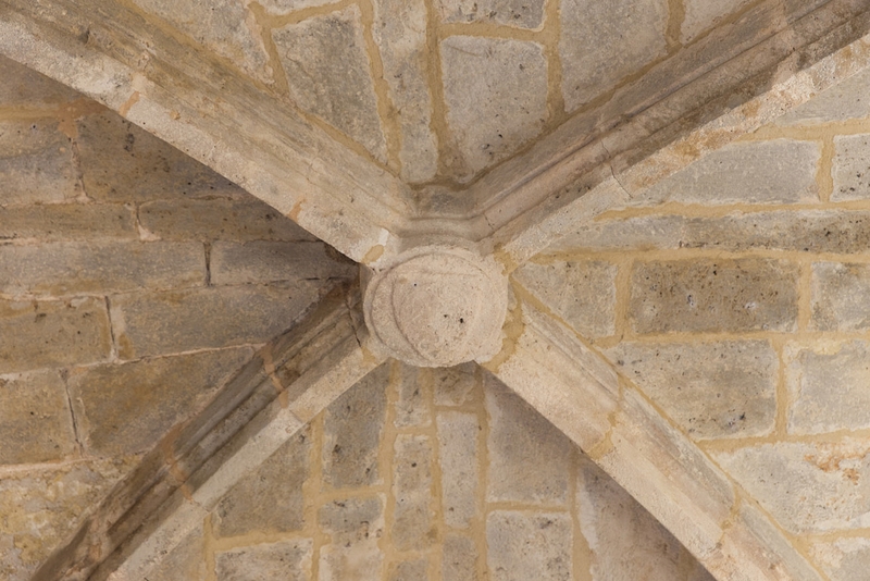 El templo es de una sola nave cubierta por bóveda de cañón apuntado, dividida en nueve tramos por arcos fajones de sillería también apuntados.