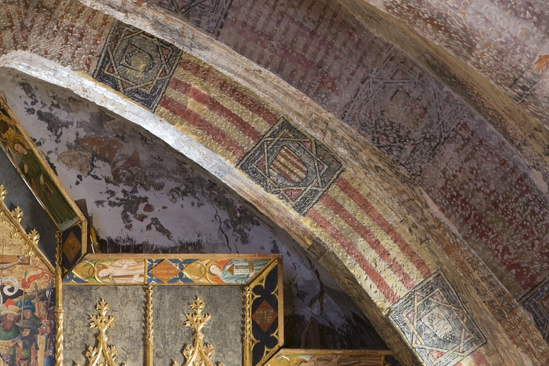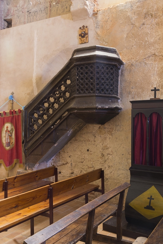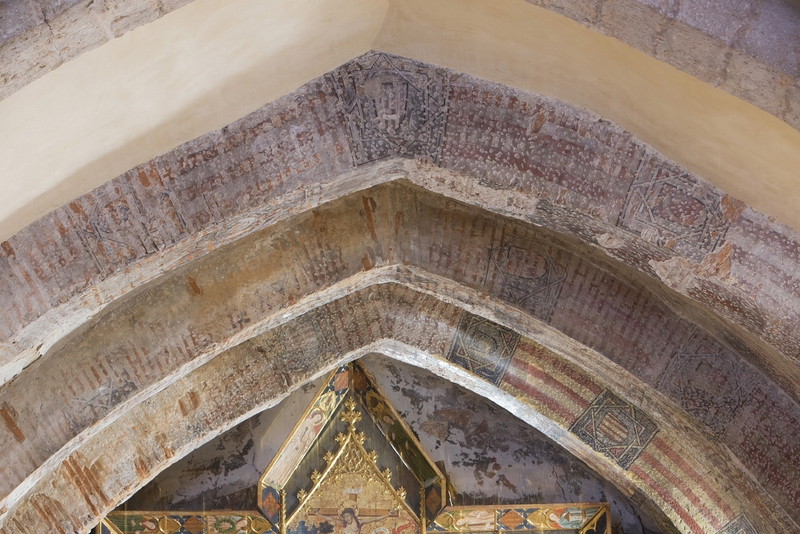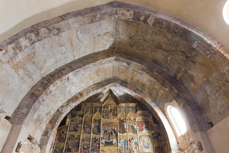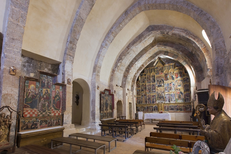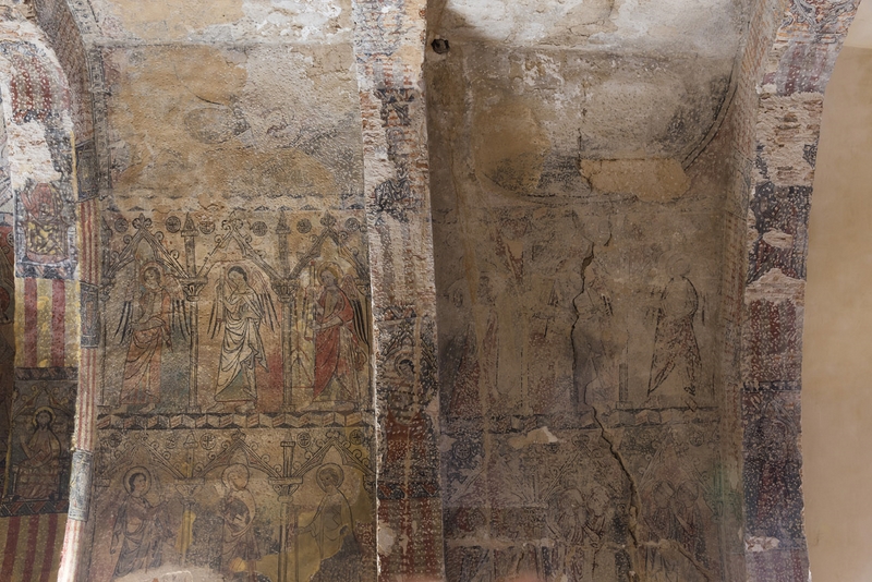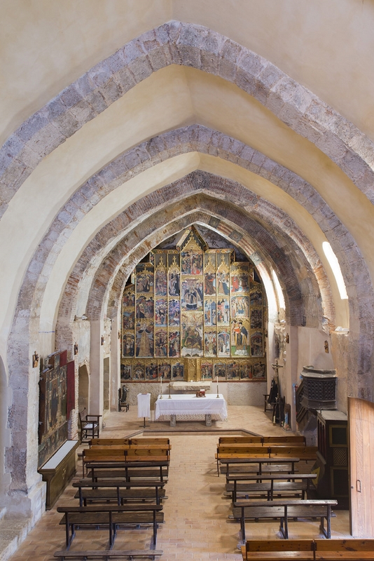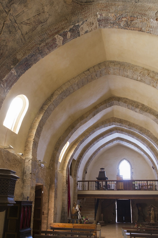En el interior de la iglesia se desarrolla un ciclo pictórico en la bóveda del ábside de la primera época de la iglesia. Parece que toda la iglesia estaba decorada con pinturas murales a partir de la segunda mitad del siglo XIV. Se han conservado sólo las del ábside y parte de la cabecera, aunque ahora son visibles sólo las del lado de la epístola. Están dentro del estilo llamado lineal o franco-gótico.
